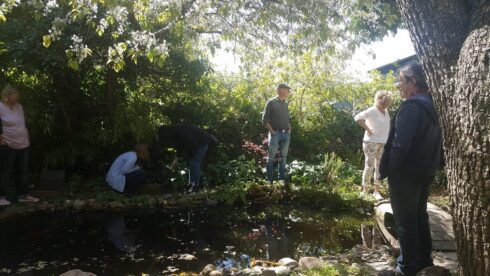Öppen trädgård med konstutställning.
